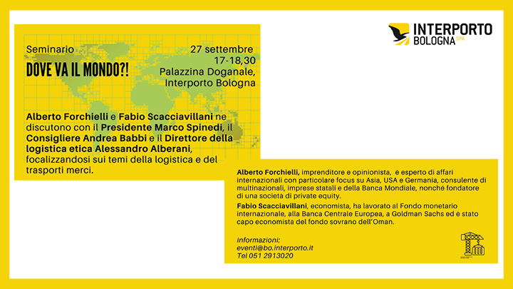Venerdì 27 settembre Alberto Forchielli e Fabio Scacciavillani saranno in Interporto per confrontarsi su "dove va il mondo", focalizandosi sul settore del trasporto merci e della logistica.