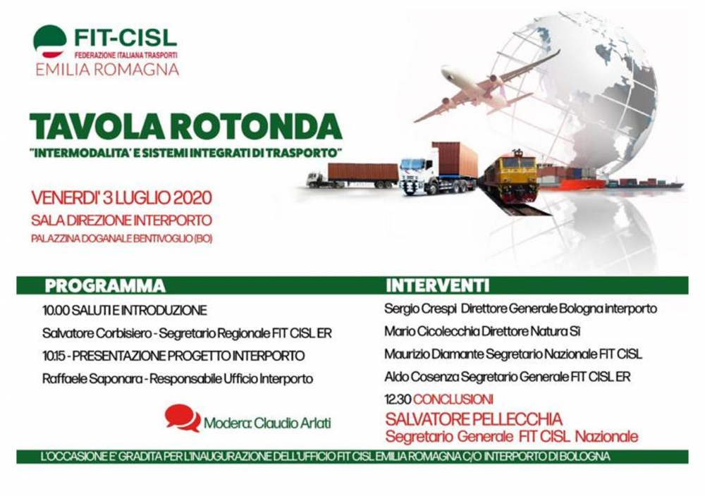 L'evento vedrà tra i relatori Salvatore Corbisiero, Segretario Regionale FIT CISL ER, Raffaele Saponara, Responsabile del nuovo ufficio in Interporto, Sergio Crespi, Direttore Generale di Interporto Bologna, Mario Cicolecchia, Direttore della Logistica di EcorNaturaSì, Maurizio Diamante, Segretario Nazionale FIT CISL, Aldo Cosenza, Segretario Generale FIT CISL ER e Salvatore Pellecchia, Segretario Generale FIT CISL Nazionale. La giornata sarà moderata da Claudio Arlati.