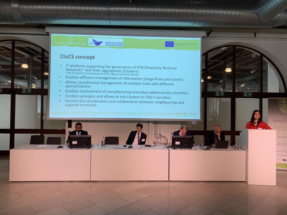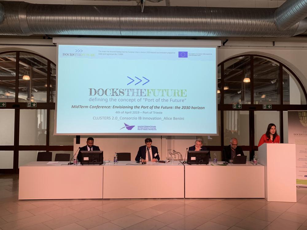 On April 4th Consorzio IB Innovation, spin off of Interporto Bologna dedicated to R&D, presented Clusters 2.0 project at DocksTheFuture (co-funded project by Horizon 2020 Programme) Mid-term conference in Trieste. The conference, titled “Envisioning the Port of the Future: the 2030 Horizon”, gave an overview on DocksTheFuture project results achieved thus far, validating concepts, topics and targets for the Port of the Future, including also the input of other projects dealing with ports. Consorzio IB Innovation was invited to the conference to present Clusters 2.0 objectives and results and how the innovations developed in the project can contribute to design the Port of the Future.