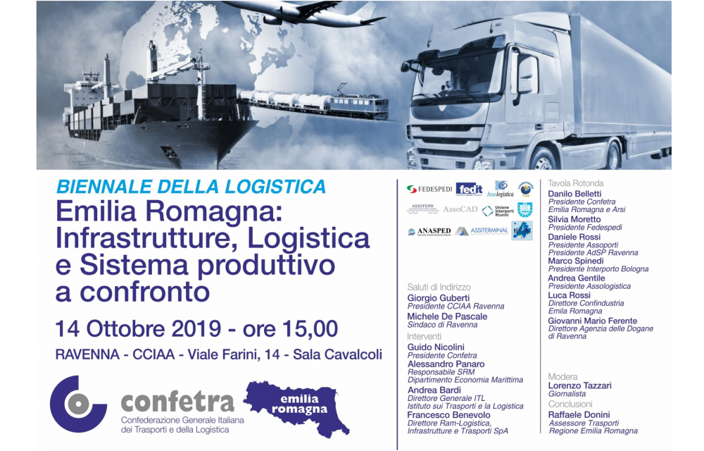Confetra Emilia Romagna, una delle costole territoriali dell'Associazione nazionale, inaugura la propria stagione convegnistica con la "Biennale della Logistica - Emilia Romagna: Infrastrutture, Logistica e Sistema produttivo a confronto" che si svolgerà il prossimo 14 ottobre a Ravenna presso la Camera di Commercio, Sala Cavalcoli, in Viale Farini alle ore 15,00.
