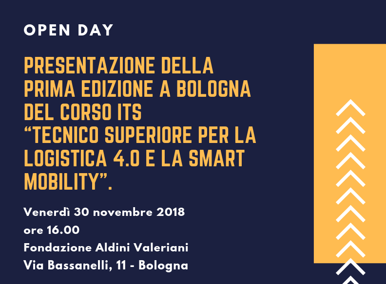 Venerdì 30 novembre alle ore 16.00 presso la Fondazione Aldini Valeriani in via Bassanelli 11 a Bologna, si terrà l'open day di presentazione del nuovo corso ITS "Tecnico superiore per la logistica 4.0 e la smart mobility", totalmente finanziato dalla Regione Emilia Romagna.